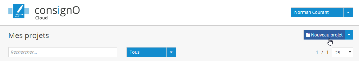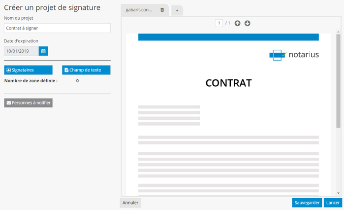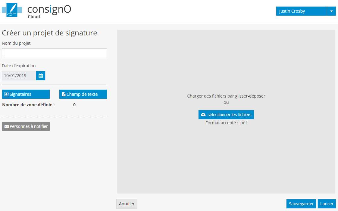 Une page vous permettant de créer un projet de signature vous sera alors présentée :