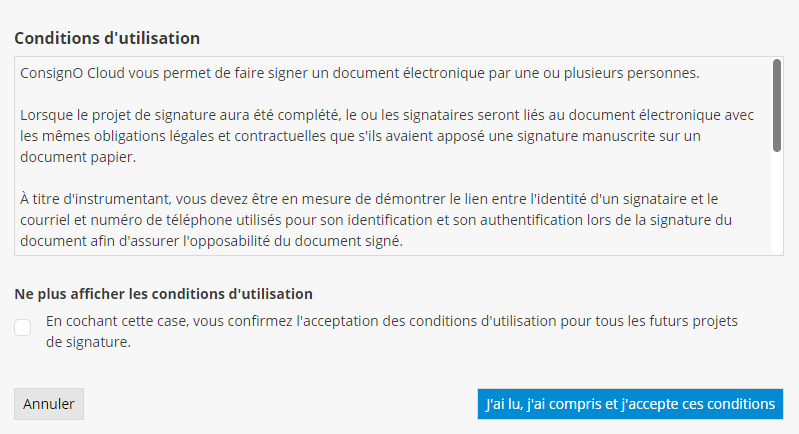 Vous pouvez choisir de ne plus afficher les conditions d’utilisation lors de vos prochains projets de signature en cochant la case prévue à cet effet.