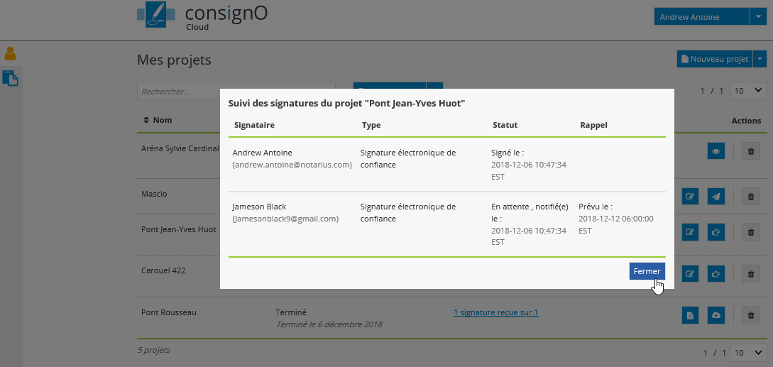 - Terminé – Le projet de signature est terminé, et tous les signataires ont signé. Le journal d’audit ainsi que les documents signés sont disponibles.