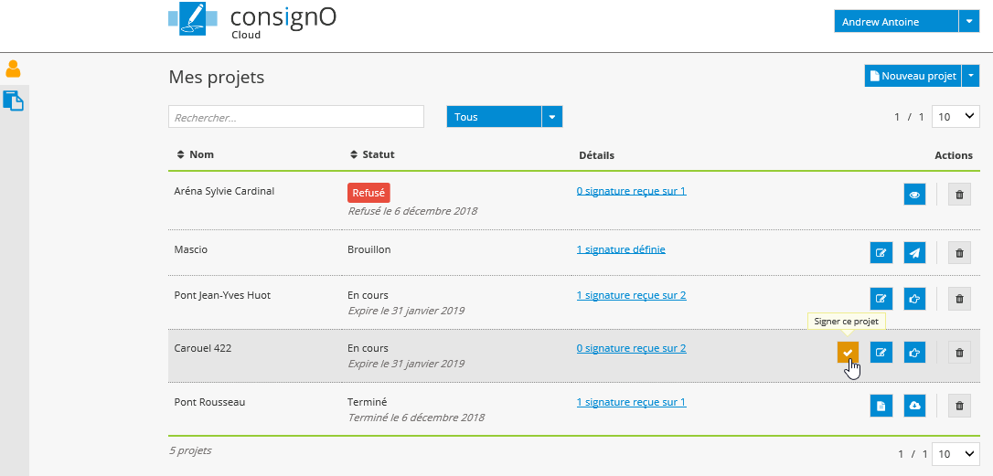 - À signer – Le projet de signature requiert la signature du gestionnaire de projet.
