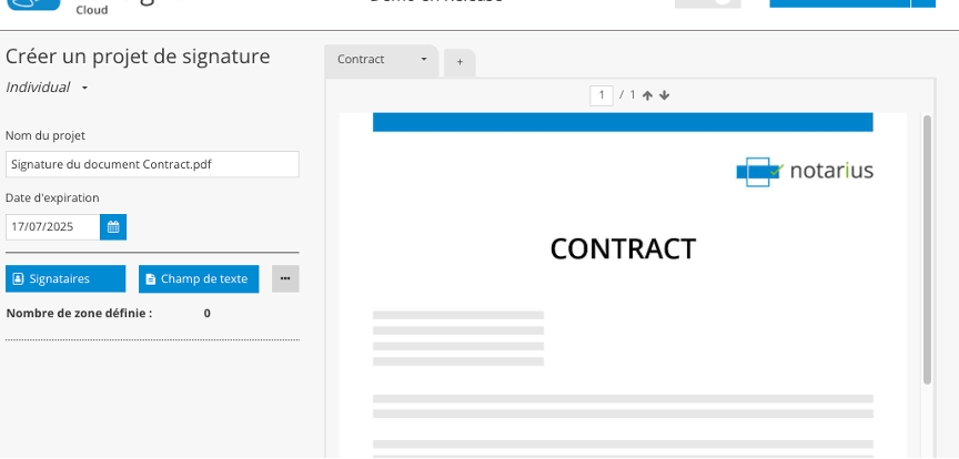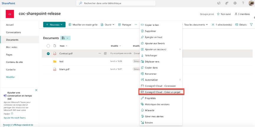 Pour créer un projet de signature à partir de SharePoint, deux options sont disponibles :