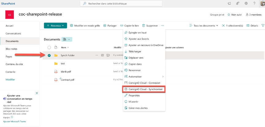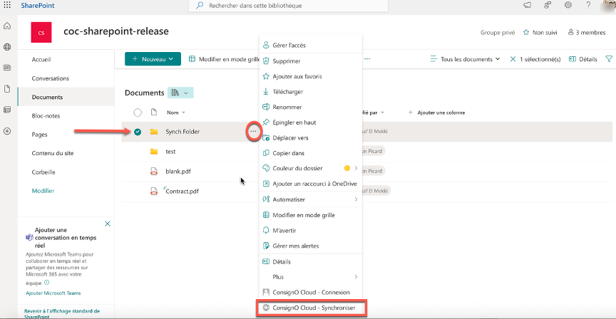 Dans la section « Documents », sélectionnez simplement le dossier dans lequel vous souhaitez enregistrer les documents signés. Ensuite, dans le menu, sélectionnez l’option « Synchroniser ».