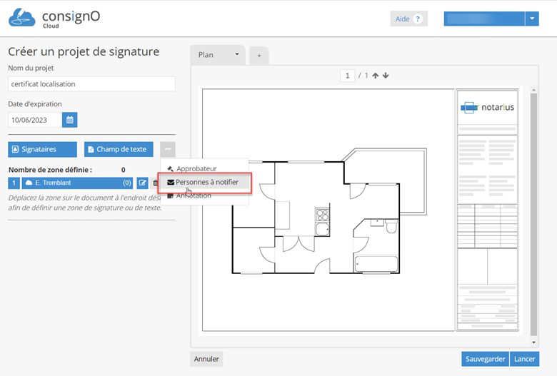 Une ou plusieurs personnes à notifier peuvent être définis dans un projet de signature. Cependant, une fois un projet de signature complété, il n’est pas possible d’ajouter des personnes à notifier, il faut alors utiliser la fonction “Transférer” depuis le tableau de bord.