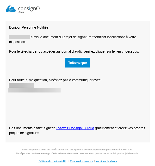 La fonction « Personne à notifier » permet de notifier automatiquement une personne définie afin qu’elle puisse accéder aux documents du projets de signature complété. Cette personne reçoit alors un courriel lui permettant de télécharger le projet de signature complété, une fois cette dernière authentifiée.