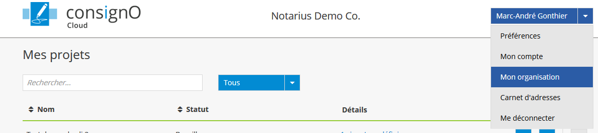 Pour pouvoir accéder à l’API, la plateforme doit s’authentifier à l’aide d’une clé d’authentification et d’un code secret. Si vous détenez un rôle Administrateur ou Gestionnaire, vous pouvez accéder à l’option Mon organisation depuis le menu principal afin d’obtenir une telle combinaison clé-secret.