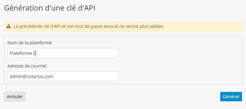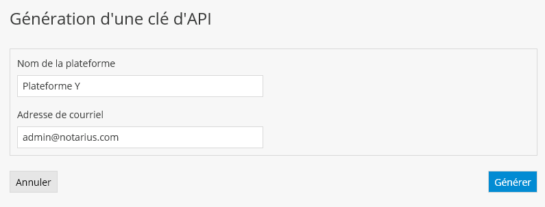 Entrez ensuite le nom de la plateforme qui utilisera l’API ainsi que l’adresse de courriel qui sera utilisée pour communiquer avec les signataires, puis appuyez sur Générer.
