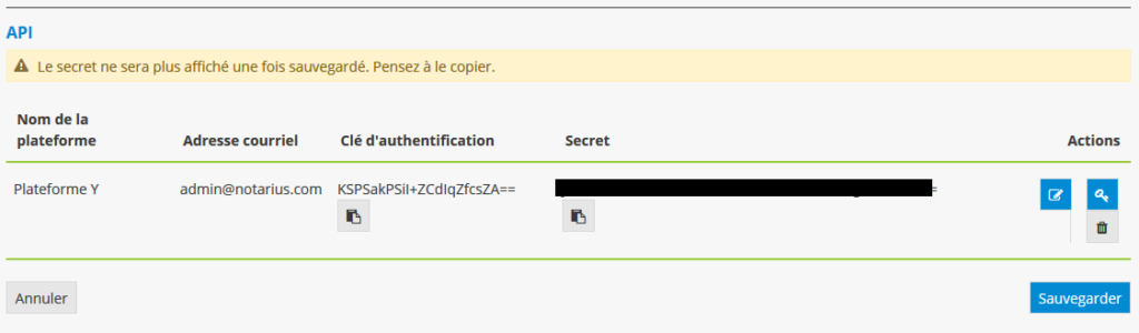 Une combinaison clé-secret vous sera alors présentée. Assurez-vous de copier le secret à cette étape afin de pouvoir authentifier la plateforme. Une fois le secret sauvegardé, il ne sera plus possible de le voir.