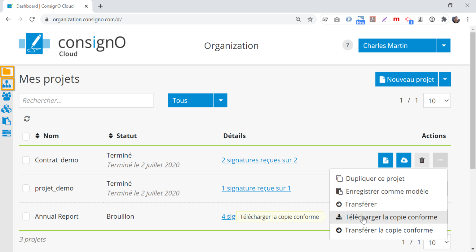 Dans le tableau de bord de l’instrumentant ou de l’organisation cliquez sur le bouton Options puis l’option Télécharger la copie conforme du projet de signature terminé