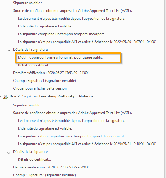 Une copie conforme sera téléchargée; cette copie affiche les apparences de signature sans la signature numérique original. Par contre une signature numérique invisible est ajoutée afin de garantir l’intégrité de la copie conforme. Le détail de cette signature numérique indiquera la mention copie conforme à l’original, pour usage au public (voir ci-dessous). Un horodatage du document sera également présent.