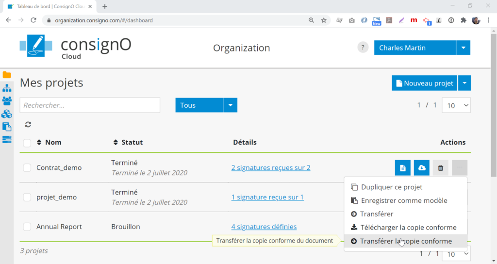 À partir du tableau de bord de l’instrumentant ou de l’organisation, cliquez sur le bouton Options puis l’option Transférer la copie conforme du projet de signature terminé.