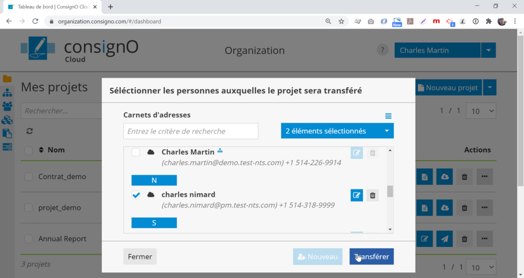 Sélectionner le ou les destinataires dans le carnet d’adresses à qui on voudrait envoyer la copie conforme du projet de signature terminé, puis cliquer sur le bouton Transférer.
