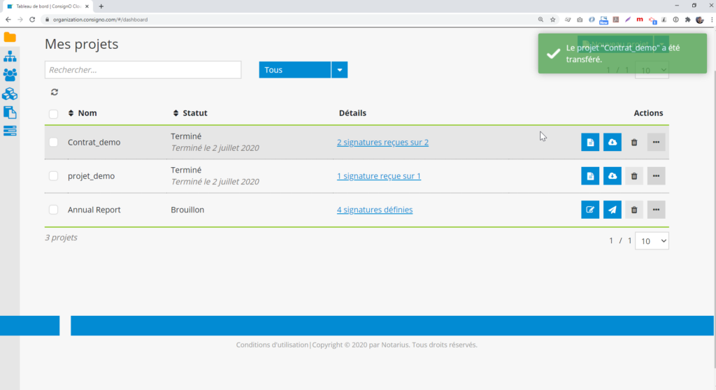 Un message confirmant l’envoi de la copie conforme va être affiché dans le tableau de bord.