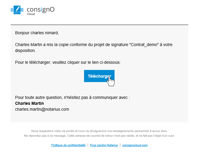 Le ou les destinataire(s) à qui ont envoyé la copie conforme vont recevoir un courriel indiquant le nom du projet avec un bouton Télécharger.