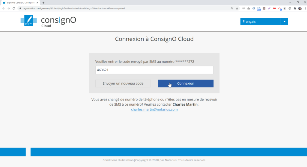 Le clic sur le bouton Télécharger va diriger sur une page de connexion à ConsignO Cloud où le destinataire devra entrer son second facteur d’authentification avant de pouvoir accéder à la copie conforme.