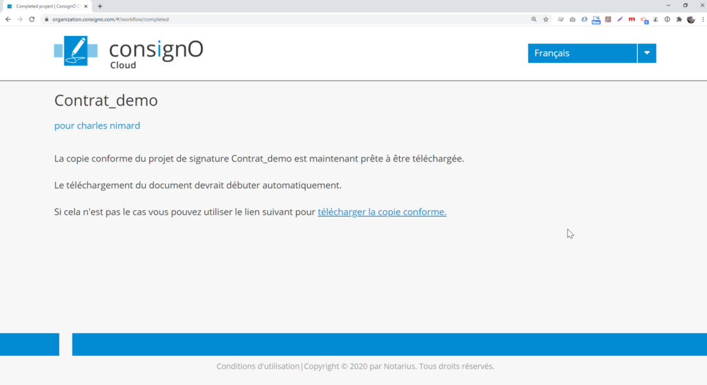 La saisie du second facteur donne accès au téléchargement automatique de la copie conforme ainsi qu’au lien de téléchargement.