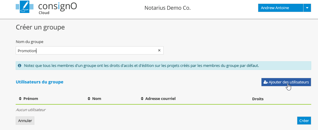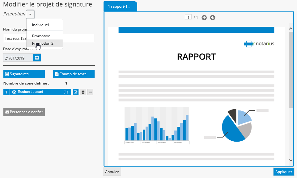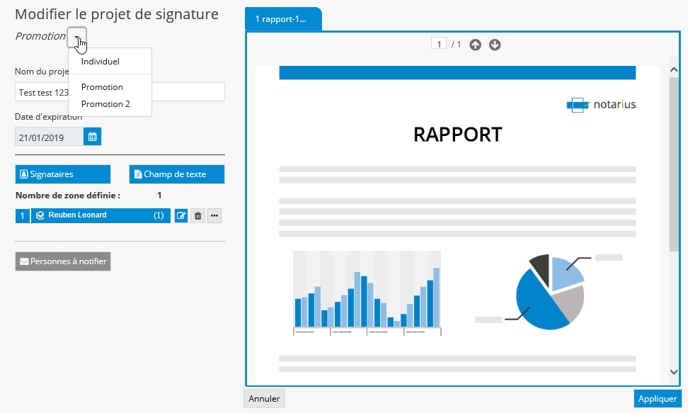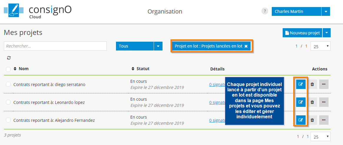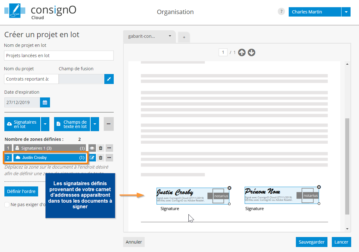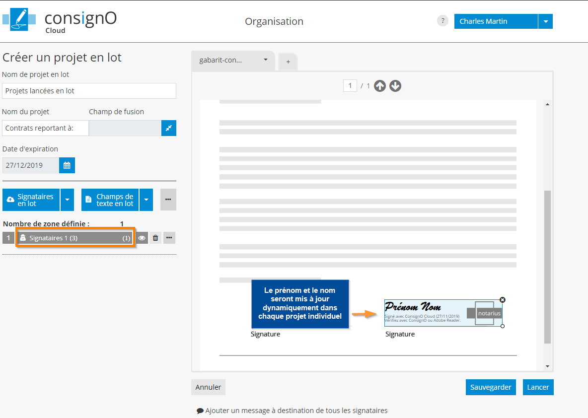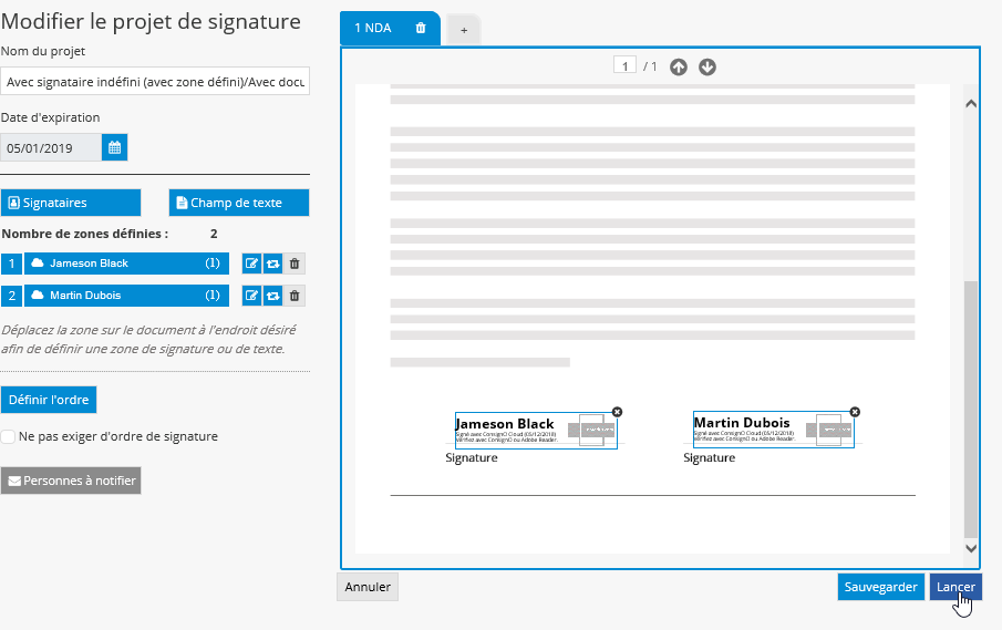 De retour sur la page de création du projet de signature, les signataires sélectionnés s’afficheront dans la section des participants du projet.