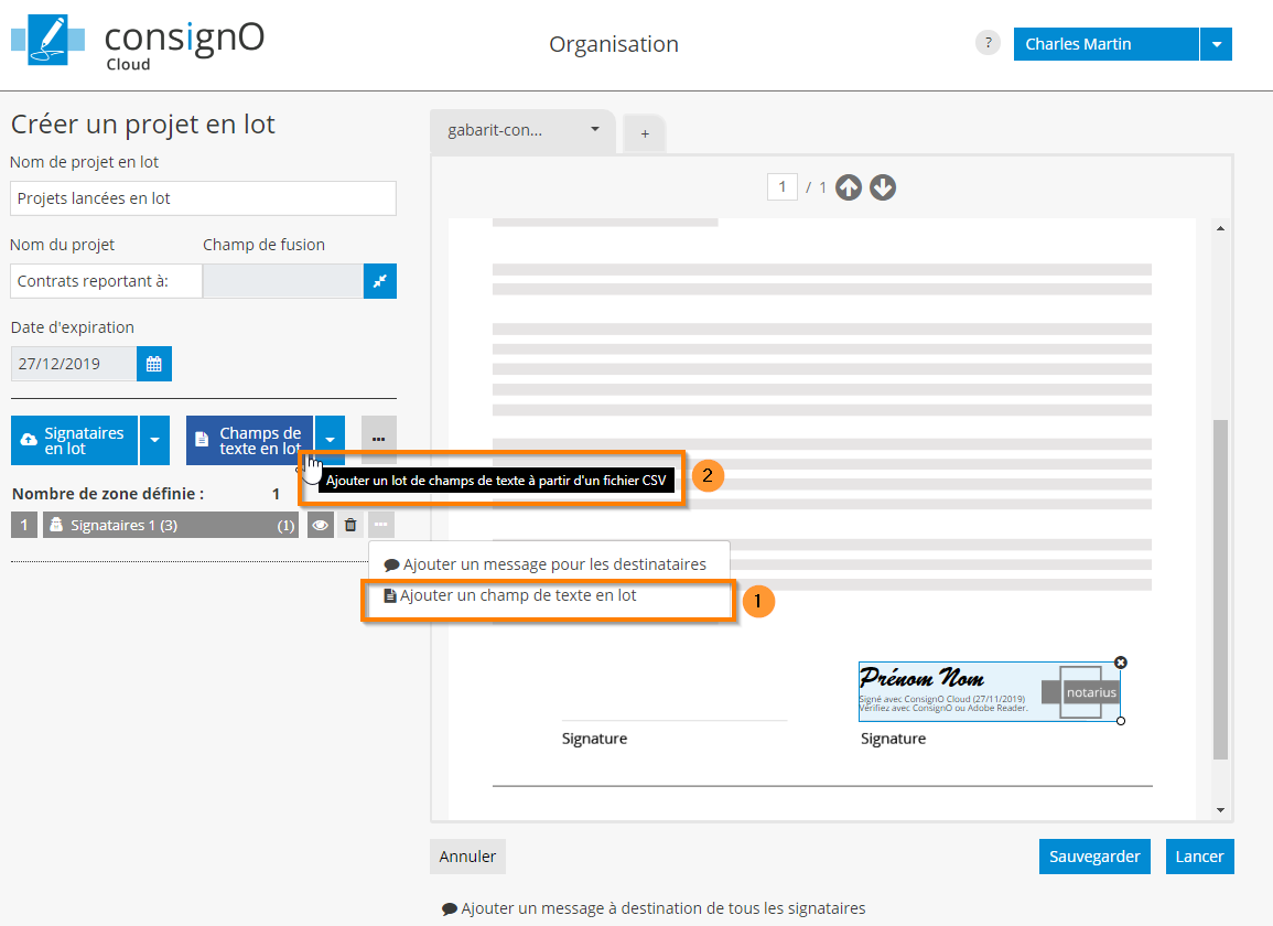 Donnez un nom à votre projet de signature en remplissant le champ Nom du projet. C'est ce nom qui sera communiqué à vos signataires et qui s’affichera dans le tableau de bord.