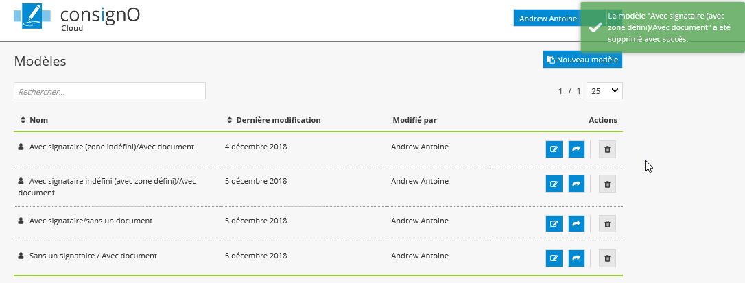 La délégation de signature est effectuée vers une autre personne. Le nouveau signataire recevra un courriel lui indiquant que sa signature est requise dans le projet de signature. Il vous est toujours possible de signer le projet ou encore d’éditer ou supprimer la délégation. Vous pouvez quitter la page.