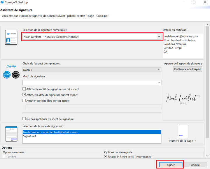 - Sélectionnez le certificat numérique du signataire recherché, puis cliquez sur Sélectionner.