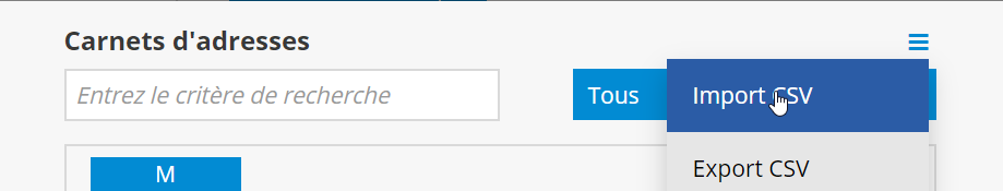 - Cliquez sur le menu en haut à droite, puis choisir l’option Import CSV.