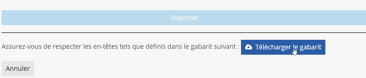 - Dans la fenêtre Import de contacts, cliquez sur Télécharger le gabarit. Cette action va télécharger le gabarit dans le répertoire de téléchargement associé à votre navigateur. Ouvrez le fichier.