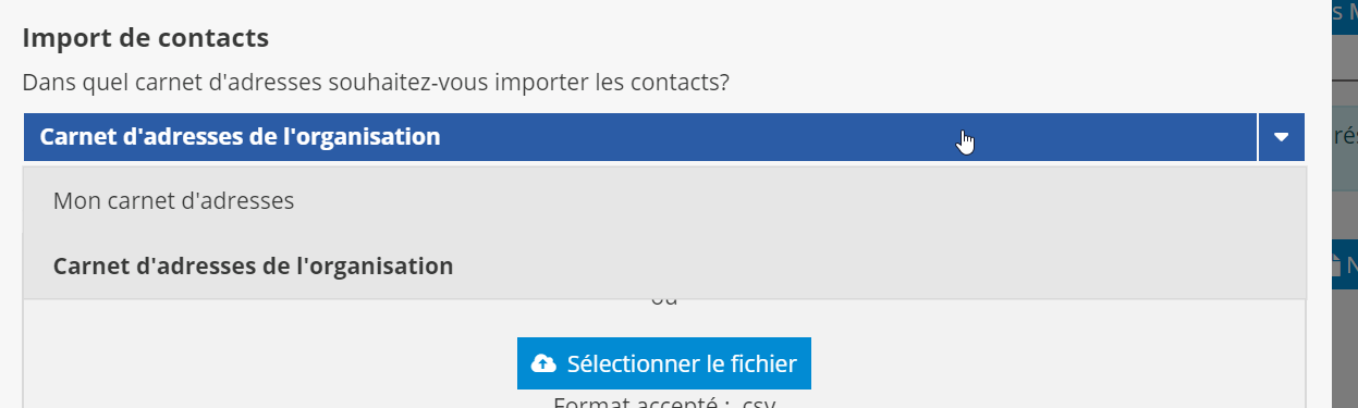 - Pour importer le fichier, retournez au menu d’importation de CSV du carnet d’adresses. Sélectionnez sur quel carnet importer les contacts. En fonction de votre rôle dans l’organisation, vous pourriez avoir différentes options, soit Mon carnet d’adresses ou Carnet d’adresses de l’organisation