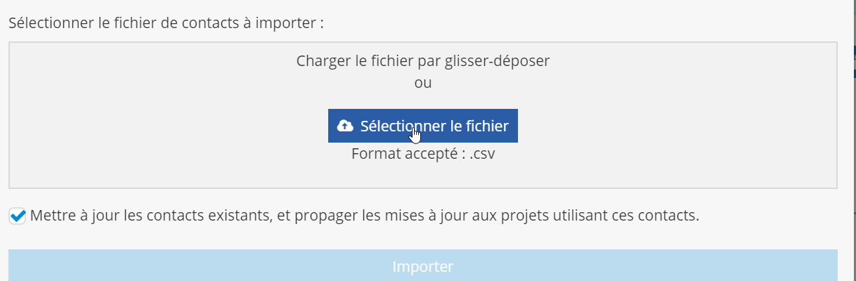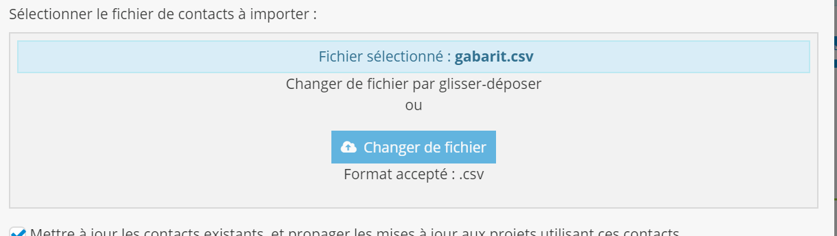 - Sélectionnez le fichier à importer à l’aide du bouton Sélectionner le fichier ou simplement charger le fichier de gabarit à importer par glisser-déposer