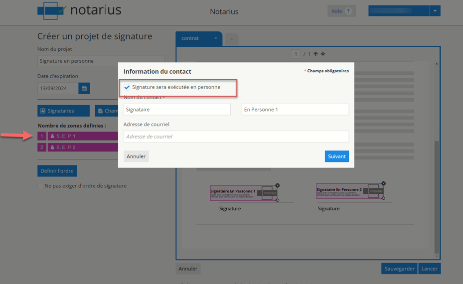 Dans la fenêtre « Informations du contact », en cochant la case « Signature sera exécutée en personne », il est exigé que le signataire participe au projet en personne.