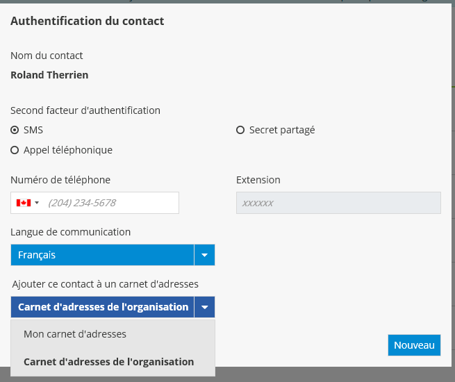 - Sélectionnez le second facteur d’authentification et la langue de communication du signataire, puis cliquez sur Nouveau.