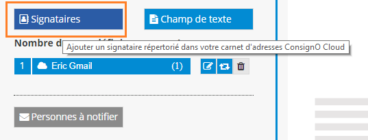 Cliquez sur Signataires afin de définir un nouveau signataire ou pour le sélectionner à partir de votre carnet d’adresses ConsignO Cloud.