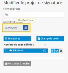 La date d'expiration est la date d'échéance qui est communiquée aux signataires d'un projet de signature. Une fois la date d'expiration atteinte, le projet de signature ne peut plus être signé. L’instrumentant peut toutefois modifier la date d'expiration d’un projet expiré. Les signataires à qui le tour était venu de signer seront alors réinvités à signer. La date d'expiration par défaut* est définie à 30 jours suivant la date de création du projet.