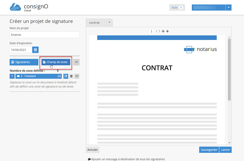 Si vous n'êtes pas prêt à lancer votre projet de signature, vous pouvez l'enregistrer en tant que brouillon en cliquant sur Sauvegarder. Le projet de signature sera alors accessible via le tableau de bord, et il aura le statut « Brouillon ».