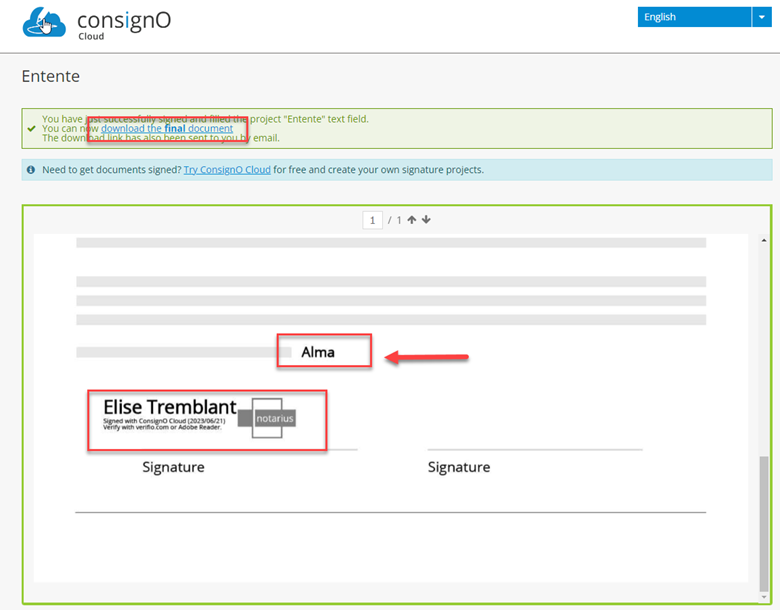 Une fois le projet lancé, chaque membre du groupe reçoit un courriel lui demandant de signer un projet de signature.